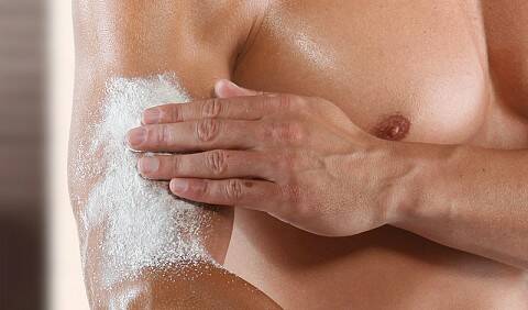 Gebruik daarvoor een hoogwaardige huidolie, en meng deze met MeineBase. De huidolie opbrengen en vervolgens met de vlakke hand het basisch zout van een bord nemen en zacht inmasseren.